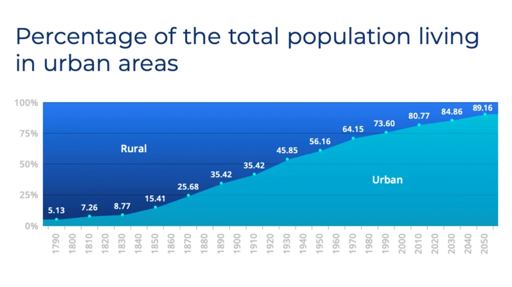 Projections indicate that by 2050, 68% of the world’s population, and 89% of the U.S. population, will reside in a city environment. This rapid urban growth – almost 10% in 25 years – places immense pressure on critical infrastructure and resources including water, electricity, telecommunications and transportation.